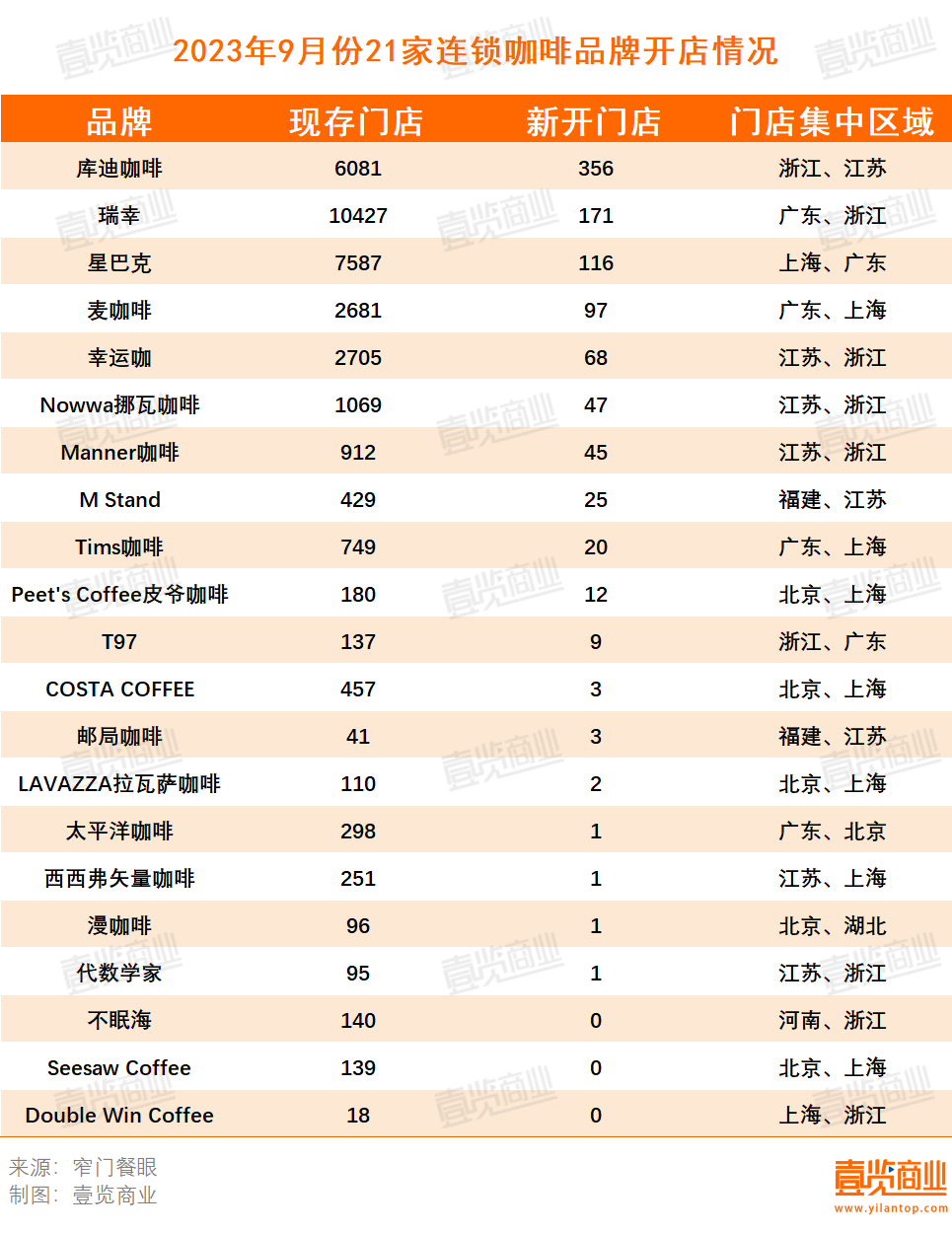 從整體開店數(shù)量看:2023年9月份,國內(nèi)21家連鎖咖啡品牌一共新開門店978家?,F(xiàn)存門店一共38126家。