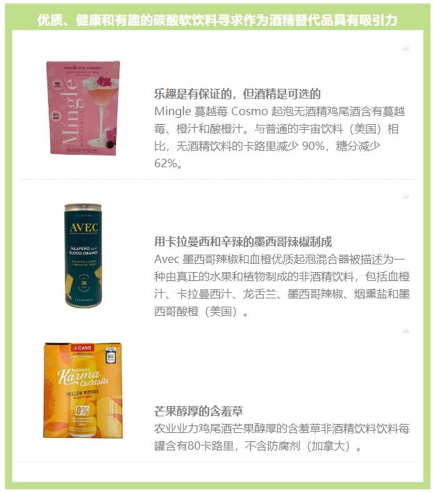 消費者對酒精替代品的高度興趣為CSD品牌提供了使用機會。為了鞏固其作為酒精替代品的地位,CSD 將需要提供更適合的品質(zhì)(例如低糖、卡路里含量)以及復制與酒精相關(guān)的特定口味期望。