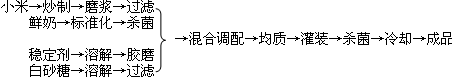 牛奶是公認(rèn)的營養(yǎng)價值較為全面的食品,但是其中不含膳食纖維且B族維生素的含量也很低。將小米汁添加到牛奶中,能實(shí)現(xiàn)二者營養(yǎng)的互補(bǔ),增強(qiáng)保健功能,生產(chǎn)出營養(yǎng)更為全面的牛奶產(chǎn)品。而且,小米經(jīng)炒制后可產(chǎn)生獨(dú)特的香味,將炒制后磨漿、過濾所得的小米汁與牛奶調(diào)合后能使小米的香味與牛奶的風(fēng)味結(jié)合,產(chǎn)生十分獨(dú)特而美好的風(fēng)味。