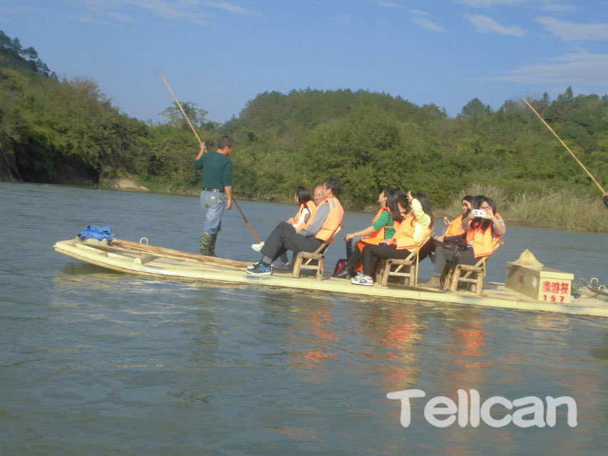 看完升棺表演,我們乘坐景區(qū)內(nèi)的公交車,再轉(zhuǎn)景區(qū)內(nèi)的小火車來到蘆溪河竹筏漂流碼頭,由于每條竹筏只能上8個(gè)人,大家分好組后,就紛紛登上竹筏,因?yàn)槭琼樍鞫?,每條竹筏上有兩位船工主要是用長(zhǎng)長(zhǎng)的竹桿控制方向。我們的竹筏剛駛?cè)牒用?,遠(yuǎn)處一條小小的竹筏便朝我們劃了過來,只見窄窄的竹筏上,坐著一位婦女,一邊雙手努力地劃著,一邊朝我們不停吆喝叫賣,到了跟前才看清,她面前放著一個(gè)小爐灶,灶上面的鍋里是“炒雞蛋”, 小竹筏上還擺放著當(dāng)?shù)赜忻摹鞍謇豸兆印奔捌渌男〕?,船工說,這是“水上超市”。河面上有七八條竹筏,再加上“水上超市”的小筏子,一路上船夫給我們講解地貌典故,妙趣生動(dòng),與山水交相輝映,真是十分壯觀。